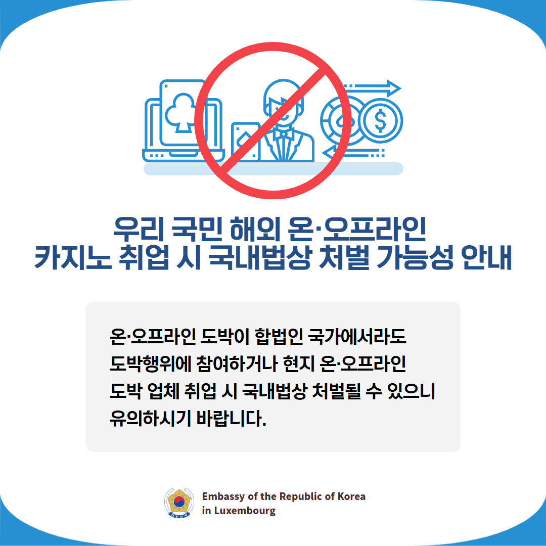 온·오프라인 도박이 합법인 국가라 하더라도 도박행위에 참여하거나 현지 온․오프라인 도박 업체(카지노 등) 취업 시 국내법상 처벌될 수 있으므로 각별히 유의하시기 바랍니다.