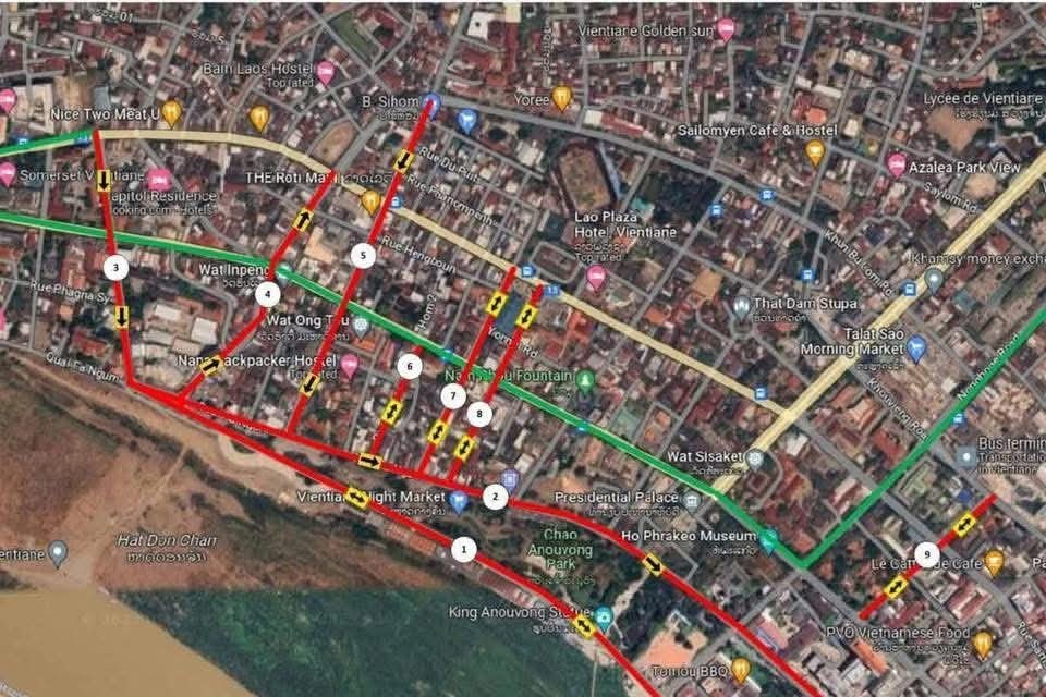 ※ 아마리 비엔티안→워크맨빌리지→마호솟 병원 응급실→던짠 호텔 입구→탓카오 사거리 방향 일방통행
