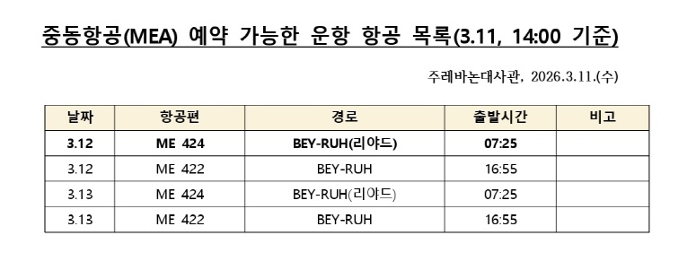 중동항공(MEA) 예약 가능한 운항 항공 목록(3.10, 10:00 기준)