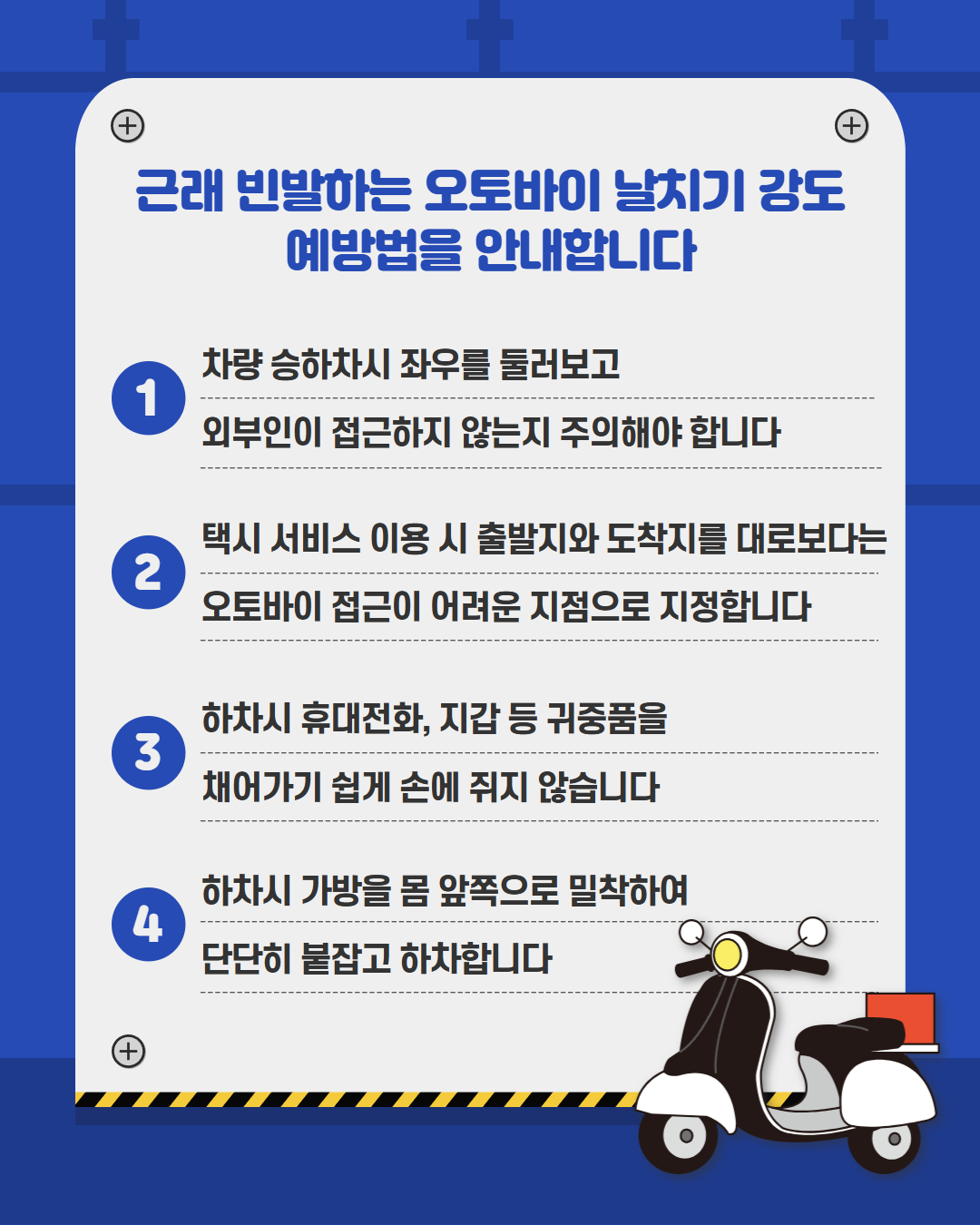 근래 빈발하는 오토바이 날치기 강도 사건사고 관련 예방법을 아래와 같이 안내합니다. 우리국민 여러분들께서는 참고하시어 안전에 유의하시기 바랍니다. 끝.