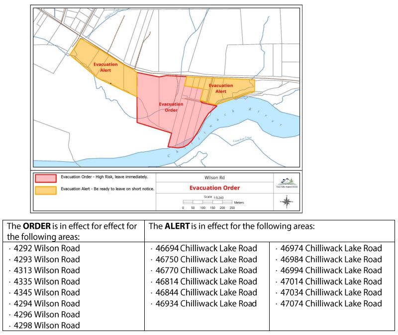 12월 10일 (수) 11:50경, 브리티시 컬럼비아주 프레이저 밸리 지역자치구(Fraser Valley Reginonal District)는 홍수로 인하여 칠리왁 호수(Electorial Area E- Chilliwack Lake) 인근 지역에 대피 경고와 윌슨 로드 지역 (Electorial Area E-Wllison Road)에 대피명령(Evacuation Order)를 발령하였습니다.