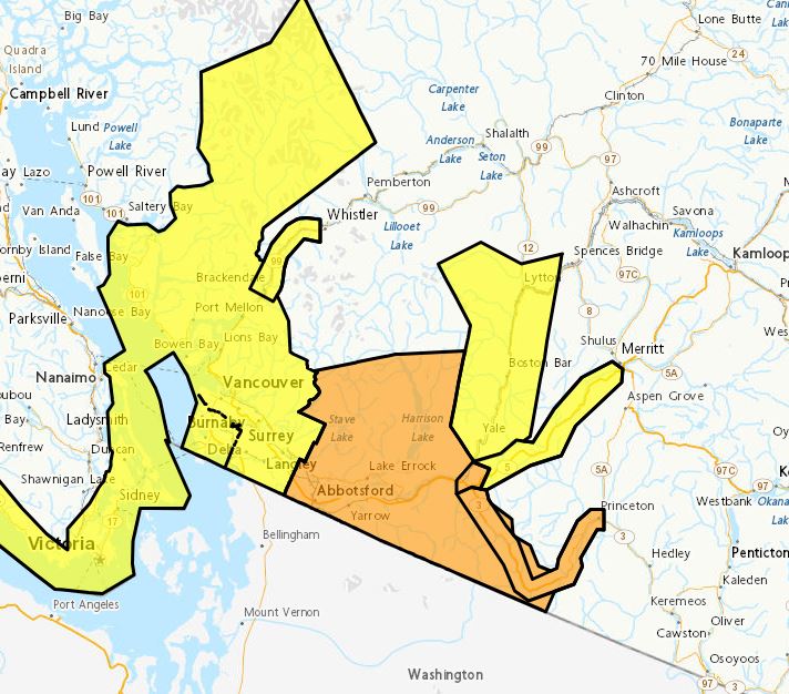 또한 연방 기상청은 프레이저 밸리 지역 내 칠리왁지역과 호프-프린스턴 구간 고속도로 (Highway 3 - Hope to Princeton) 지역의 높은 강우량으로 '주황 경보'를 발령하였습니다.