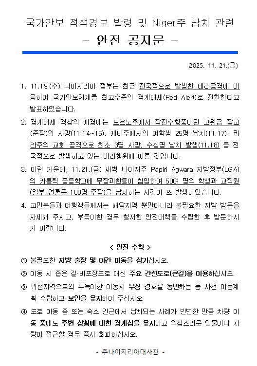 나이지리아 국가안보 적색경보 발령 및 나이저州 납치 관련