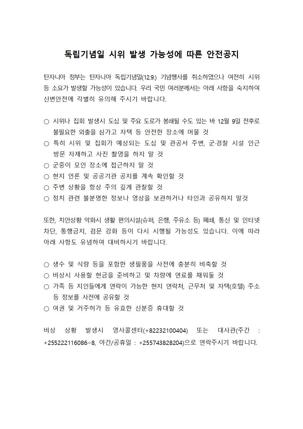 탄자니아 독립기념일(12.9) 시위 발생 가능성에 따른 안전공지
