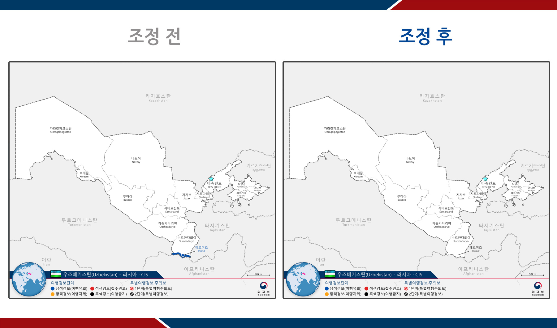 - (테레미즈 및 아프가니스탄 접경지역) 1단계 남색경보(여행유의) → 해제