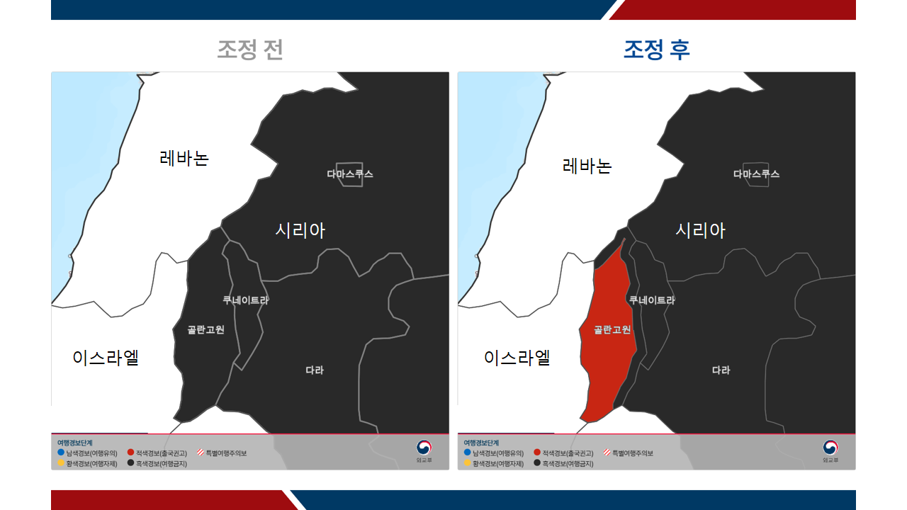 □ 협의회는 치안 상황이 개선된 이스라엘-시리아 접경 골란고원 일부 지역*에 대해서는 여행경보를 3단계(철수권고)로 하향하기로 결정하였습니다.