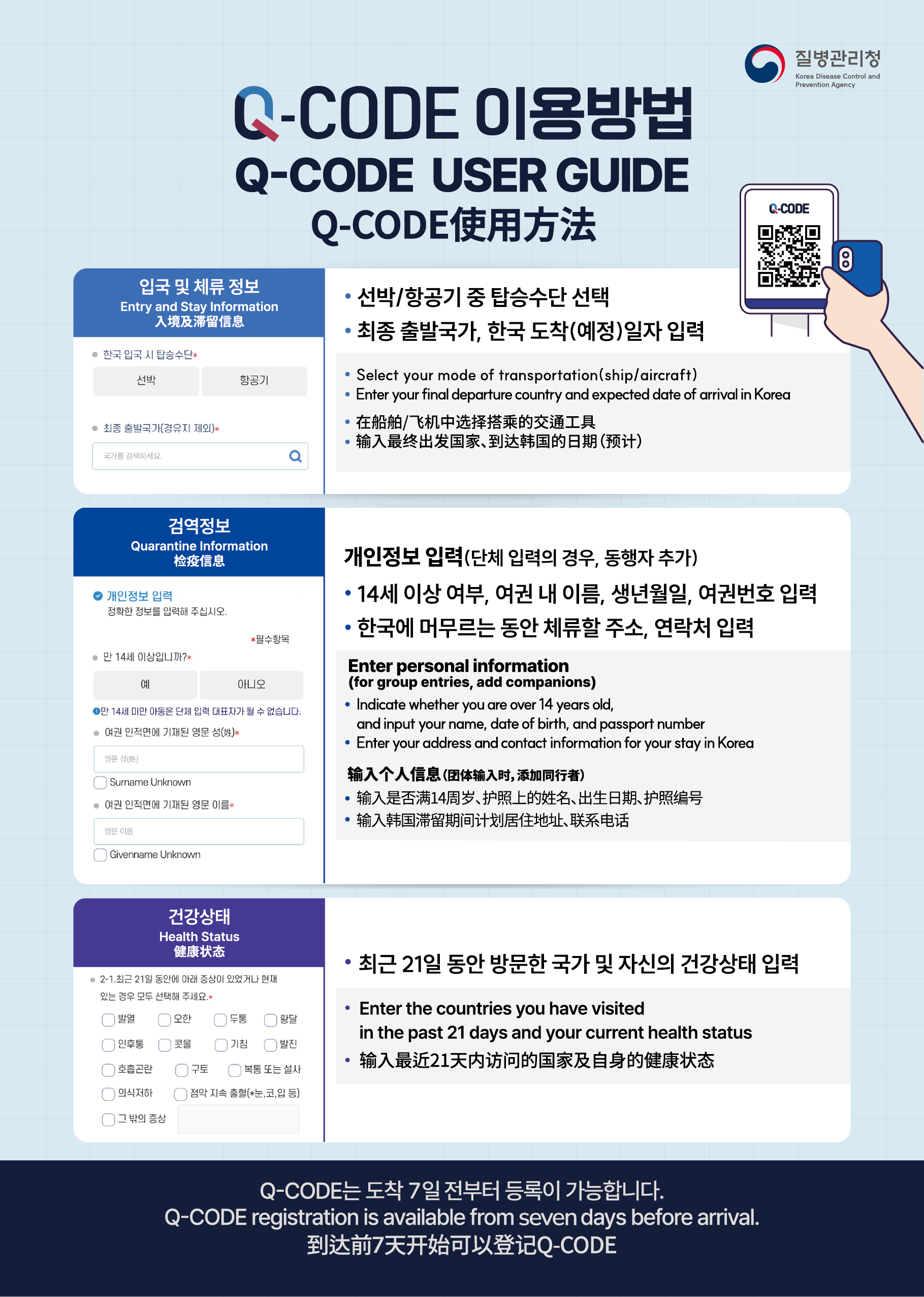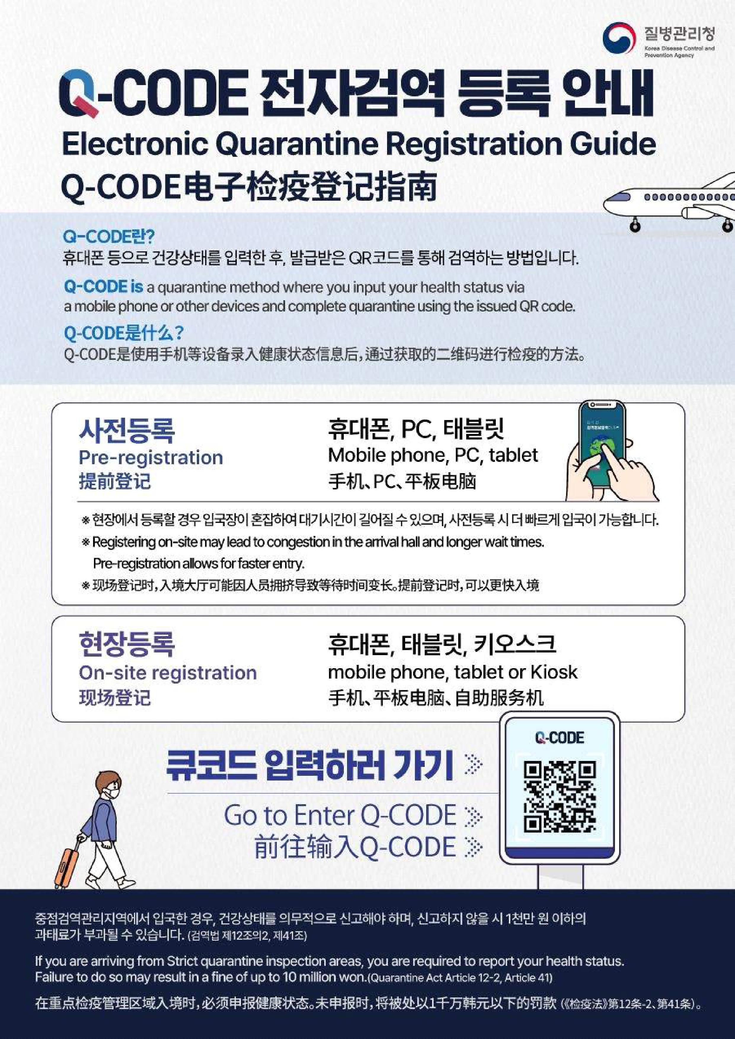 ※︎ Q-CODE는 휴대폰, PC, 태블릿 등으로 건강상태를 입력한 후 발급받은 QR코드를 통해 검역하는 방법입니다. 검역관리지역 및 중점검역관리지역을 방문(체류 또는 경유) 후 대한민국에 입국하시는 분들은 입국 전에 Q-CODE를 발급 받으면 신속한 입국이 가능합니다. |