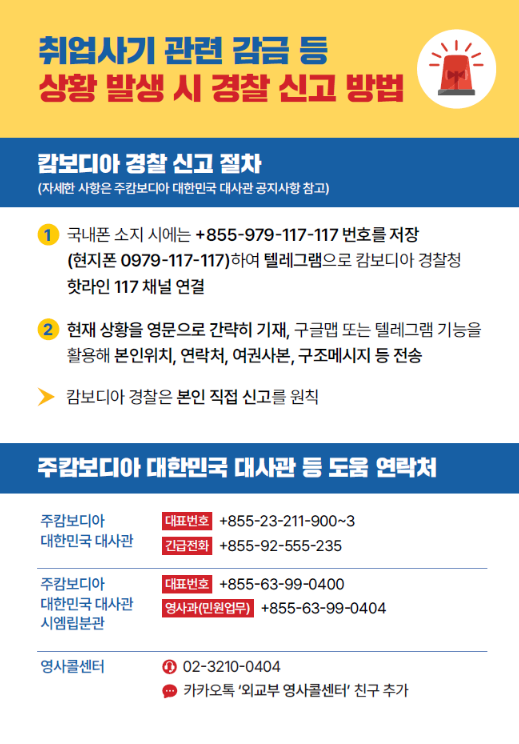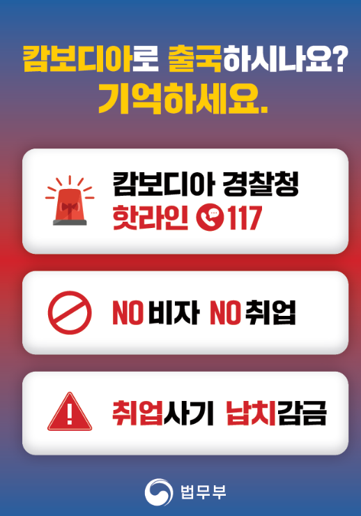 최근 캄보디아 내 한국인 대상 취업사기 피해사례가 급증함에 따라, 우리 외교부는 10.10.(금)부로 캄보디아 수도 프놈펜 등에 '특별여행주의보' 또는 '여행금지'를 발령(링크)하였으니, 우리 교민분들께서는 아래의 조치사항을 숙지하시어 안전에 유의하시기 바랍니다.