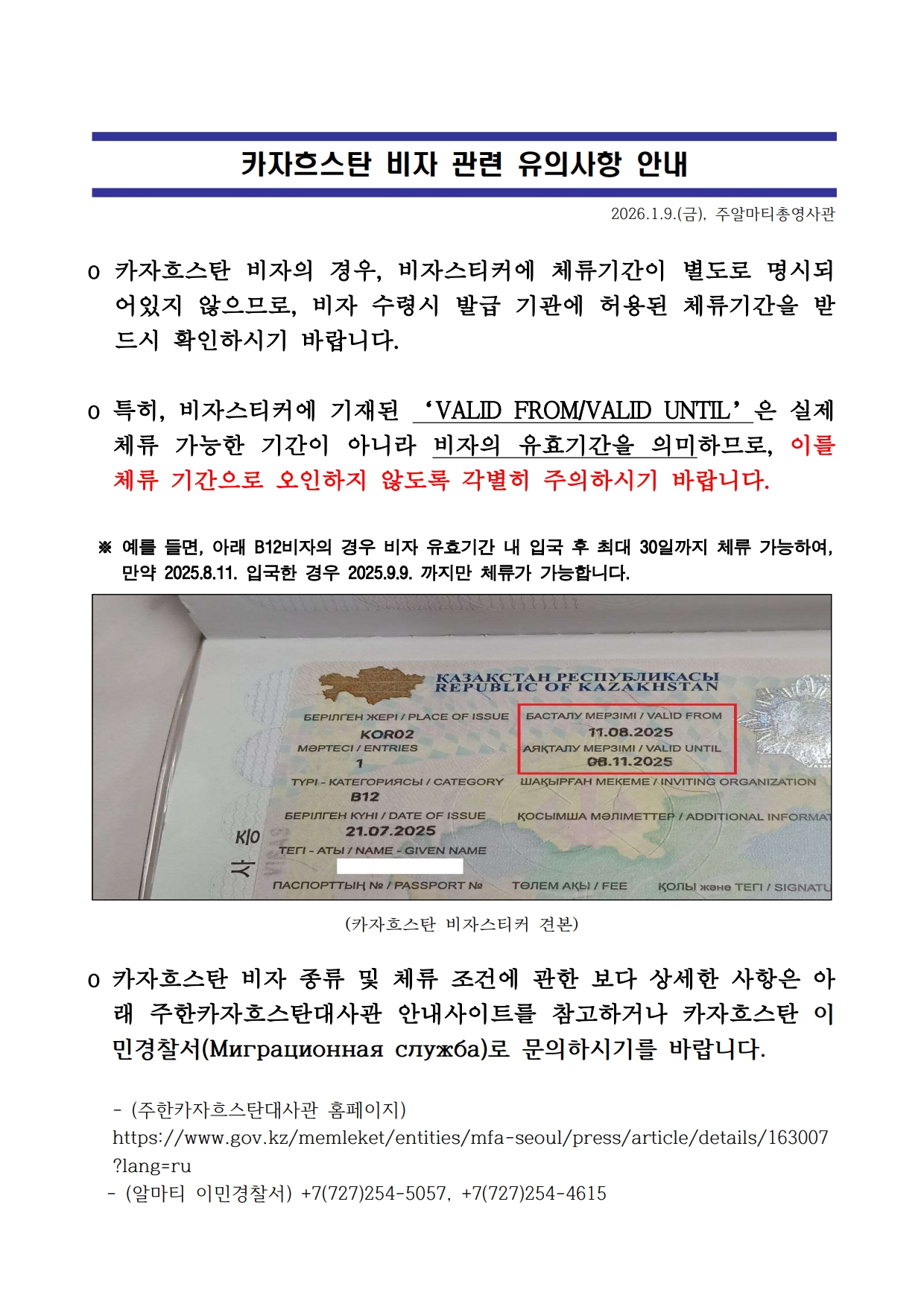 카자흐스탄 비자 관련 유의사항 안내 (체류기간)