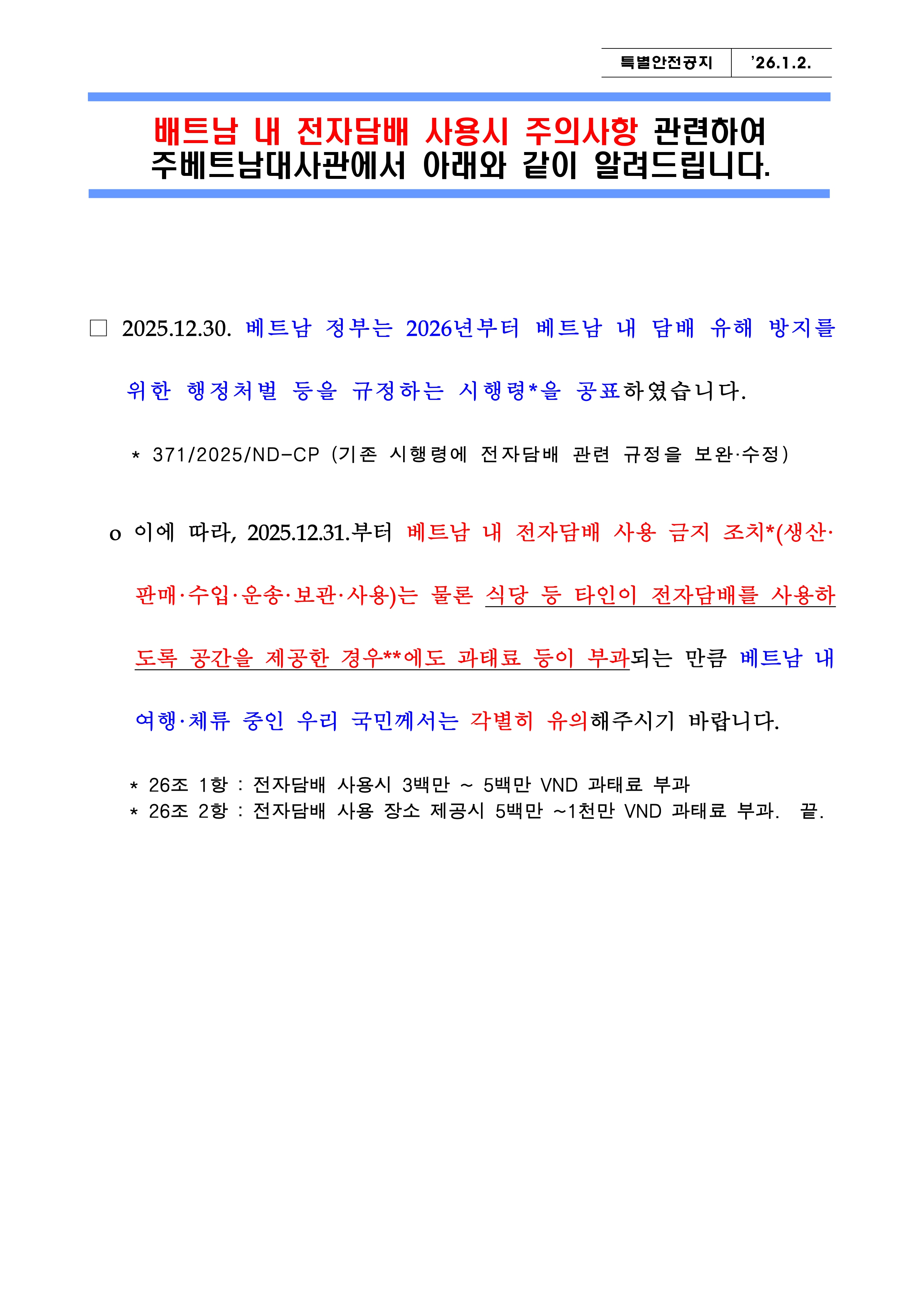 2025.12.30. 베트남 정부는 2026년부터 베트남 내 담배 유해 방지를 위한 행정처벌 등을 규정하는 시행령을 공표하였습니다.