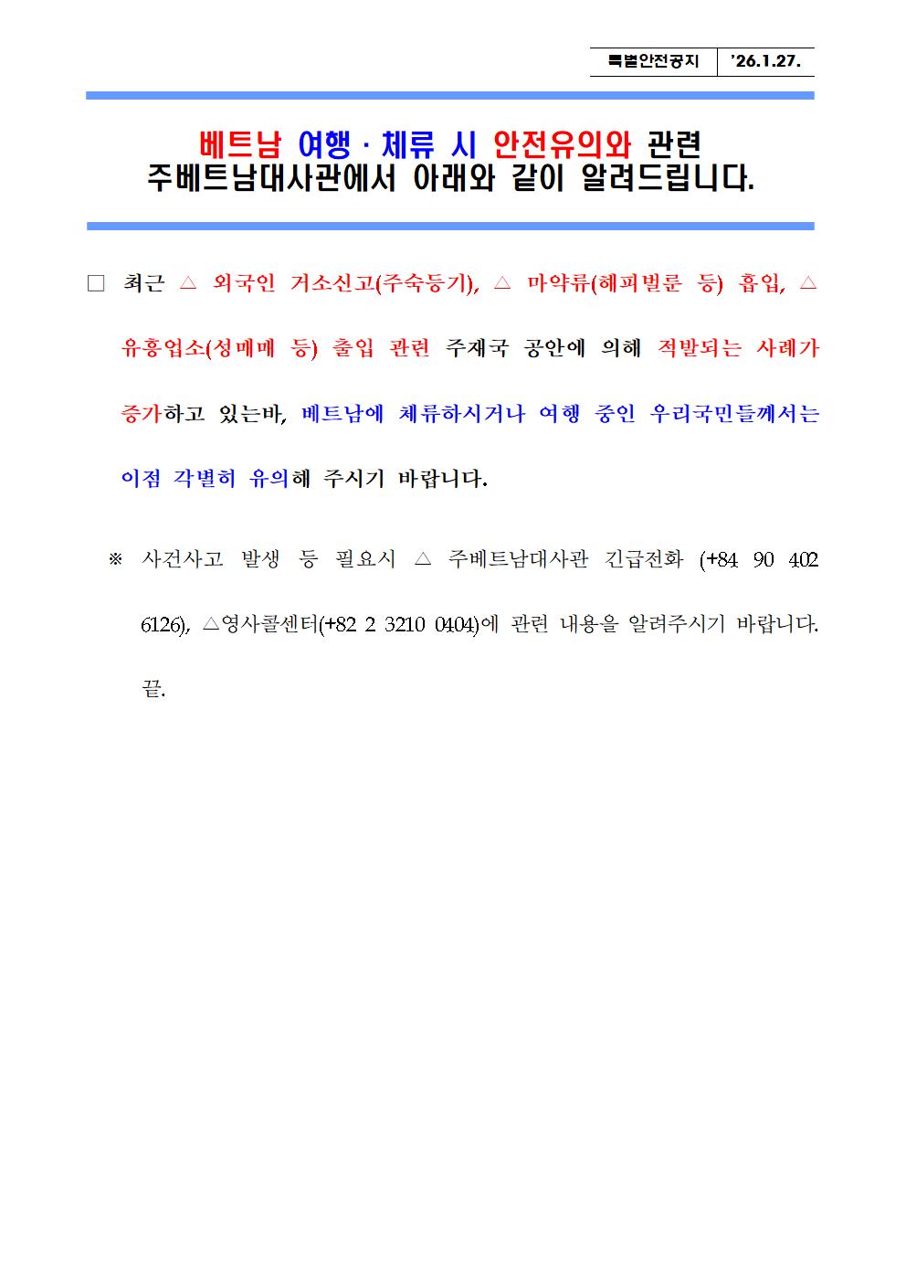 베트남에 체류하시거나 여행 중인 우리 국민께 현지 안전에 관해 다음과 같이 알려드리오니 유의하여 주시기 바랍니다. 끝.