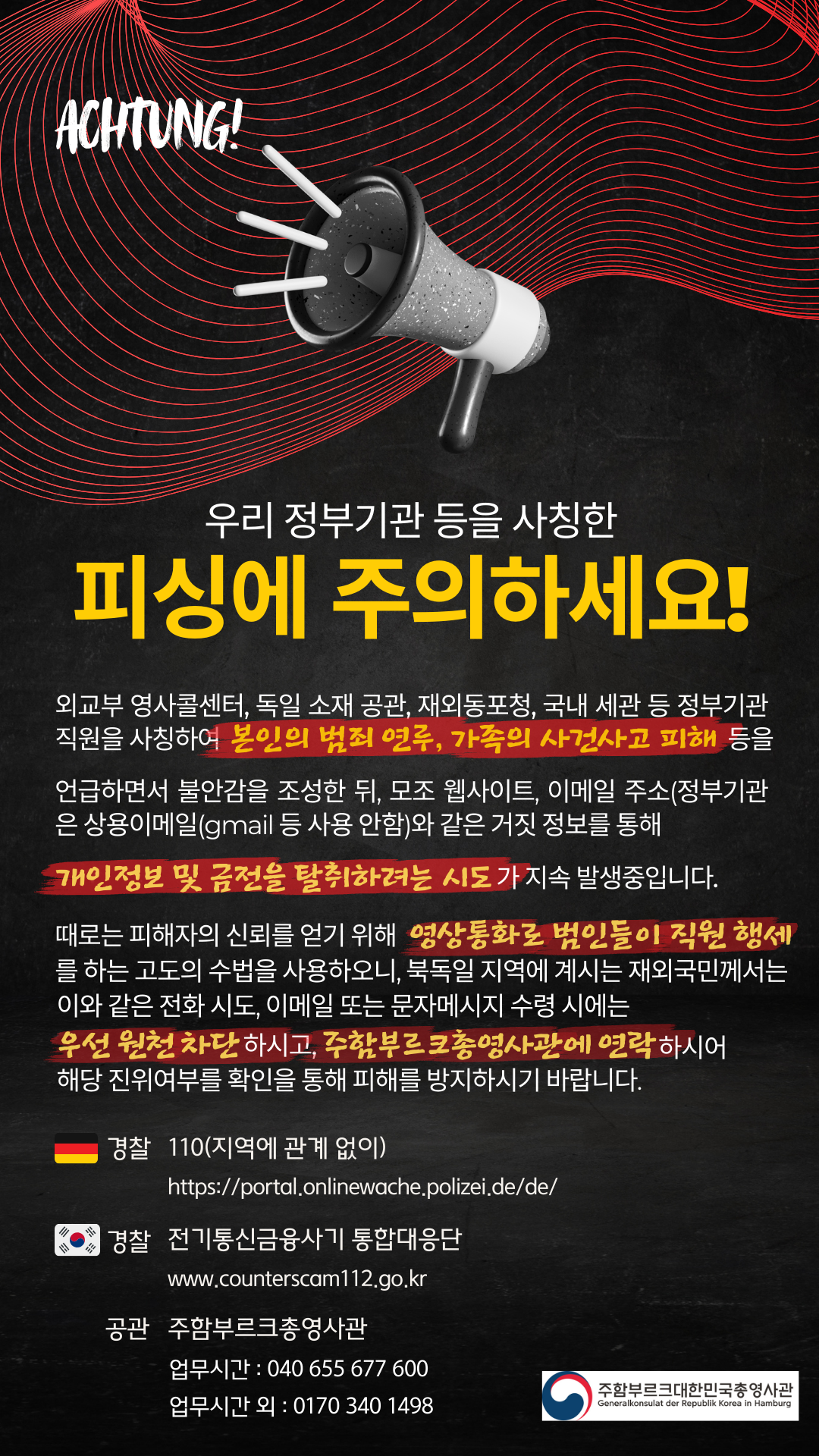 2025년부터 우리국민을 대상으로 재외공관 등 우리 정부 기관을 사칭한 피싱범죄가 성행하고 있습니다. 독일 지역 또한 해당 범죄시도가 많이 포착되고 있는 만큼, 북독일 지역을 포함한 독일 지역에 계시는 재외국민께서는 아래 포스터를 참고하시어 피해 예방에 각별히 관심을 가져주시기 바랍니다.