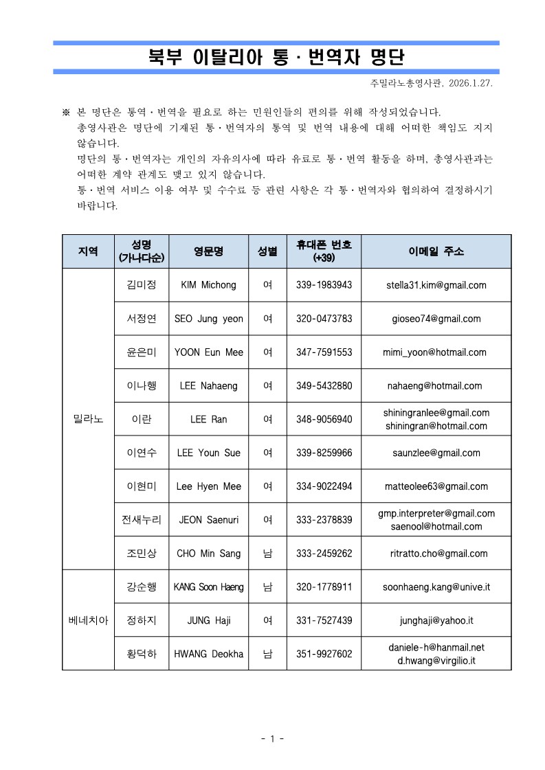 북부 이탈리아 통번역자 명단(2026.1)