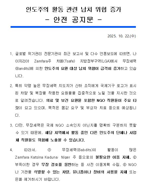 (안전공지) 인도주의 활동 관련 납치 위협 증가