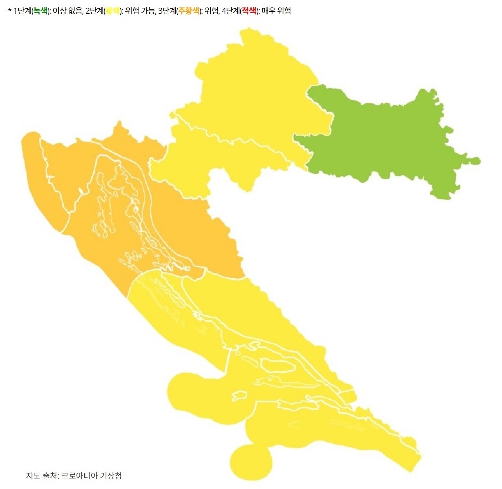 o 크로아티아 기상청은 10.23(목) 리예카 및 고스피치 지역에 강수량 최대 140mm를 예고하며 천둥, 번개를 동반한 호우경보 3단계(위험)를 발령하였습니다.