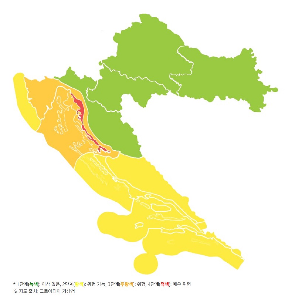 o 크로아티아 기상청은 11.28(금) 크로아티아 북중부 해안 지역인 벨레비트 해협에 최대 시속 65-165km를 예고하며 강풍경보 4단계(매우 위험)를 발령하였으며, 이스트리아 지역과 아드리아해 북부 일부 지역에 강풍경보 3단계(위험), 이외 이스트리아 반도 서부 해상과 달마티아 전역에 강풍경보 2단계(위험 가능)를 발령하였습니다.