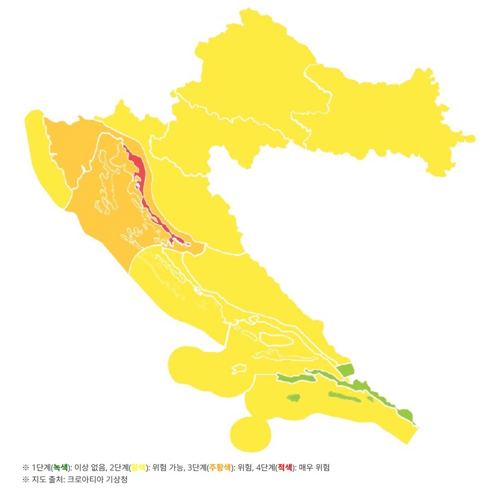 o 크로아티아 기상청은 1.7(수) 크로아티아 북중부 해안 지역인 벨레비트 해협에 최대 풍속 65-165km/h를 예고하며 강풍경보 4단계(매우 위험)를 발령하였으며, 이스트리아 반도를 포함한 아드리아해 북중부 일부 지역에 강풍경보 3단계(위험), 이외 두브로브니크 지역을 제외한 크로아티아 전역에 강풍경보 2단계(위험 가능)를 발령하였습니다.