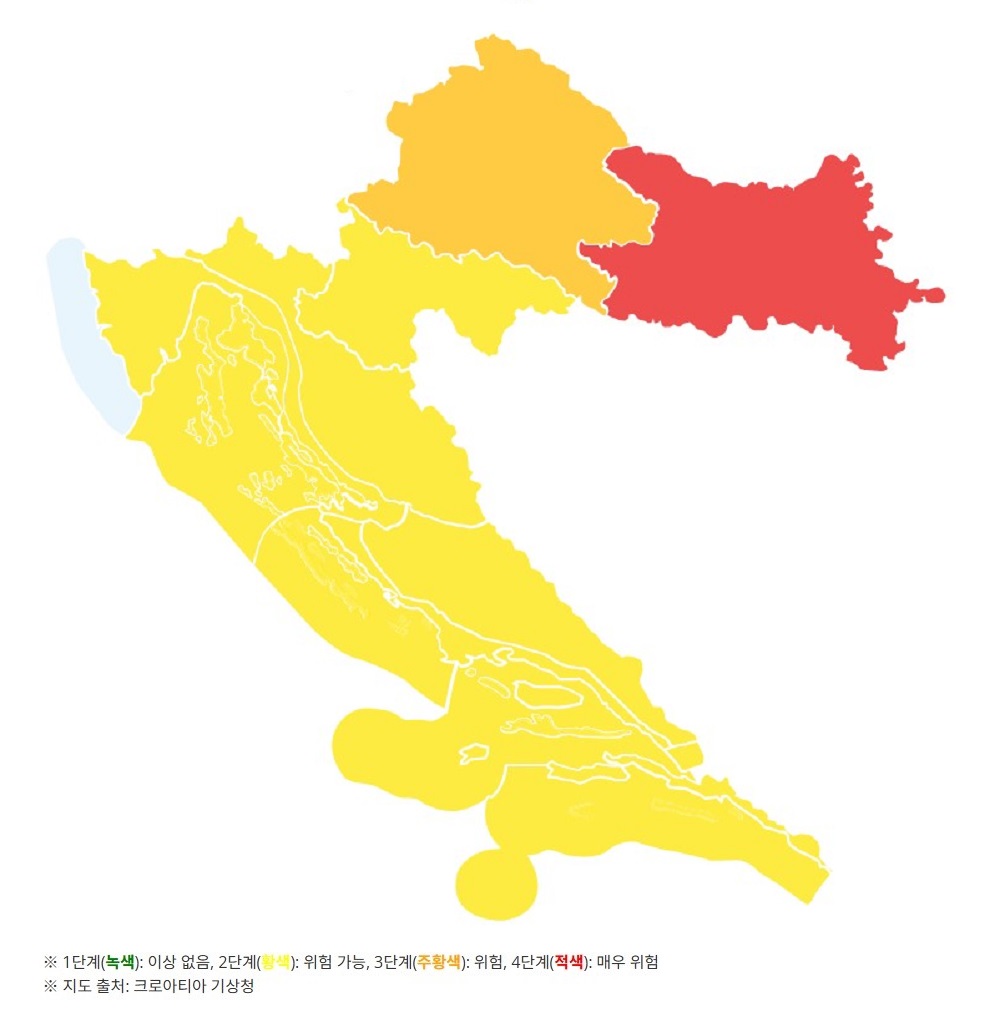 o 크로아티아 기상청은 1.9(금) 오시예크, 슬라보니아 등 크로아티아 동부 내륙 지역에 기온이 영하 10도 이하로 떨어지는 한파를 예고하며 한파주의보 4단계(매우 위험)를 발령하였으며, 자그레브 지역에 3단계(위험), 이외 크로아티아 전역에 2단계(위험 가능)를 발령하였습니다.