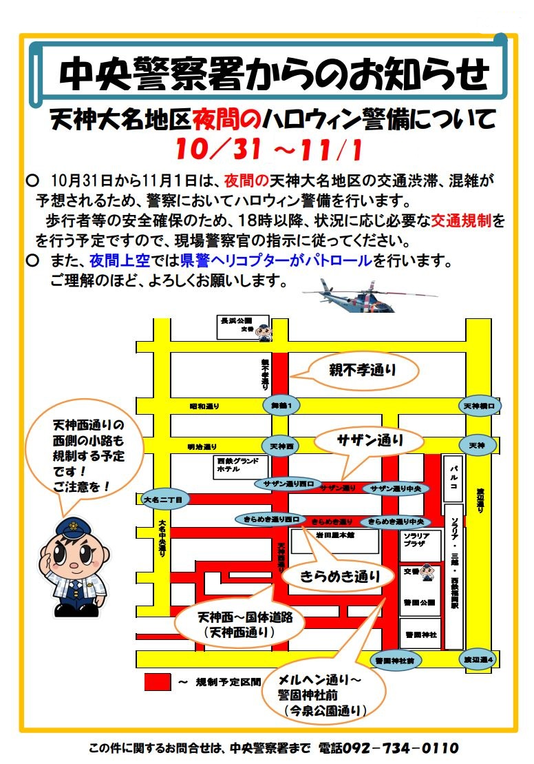 후쿠오카 중앙경찰서에서는 10.31 - 11.1 할로윈 기간 중 도로가 혼잡할 것으로 예상되는바, 텐진 및 다이묘 지역에서 야간순찰 활동을 강화한다고 발표했습니다.