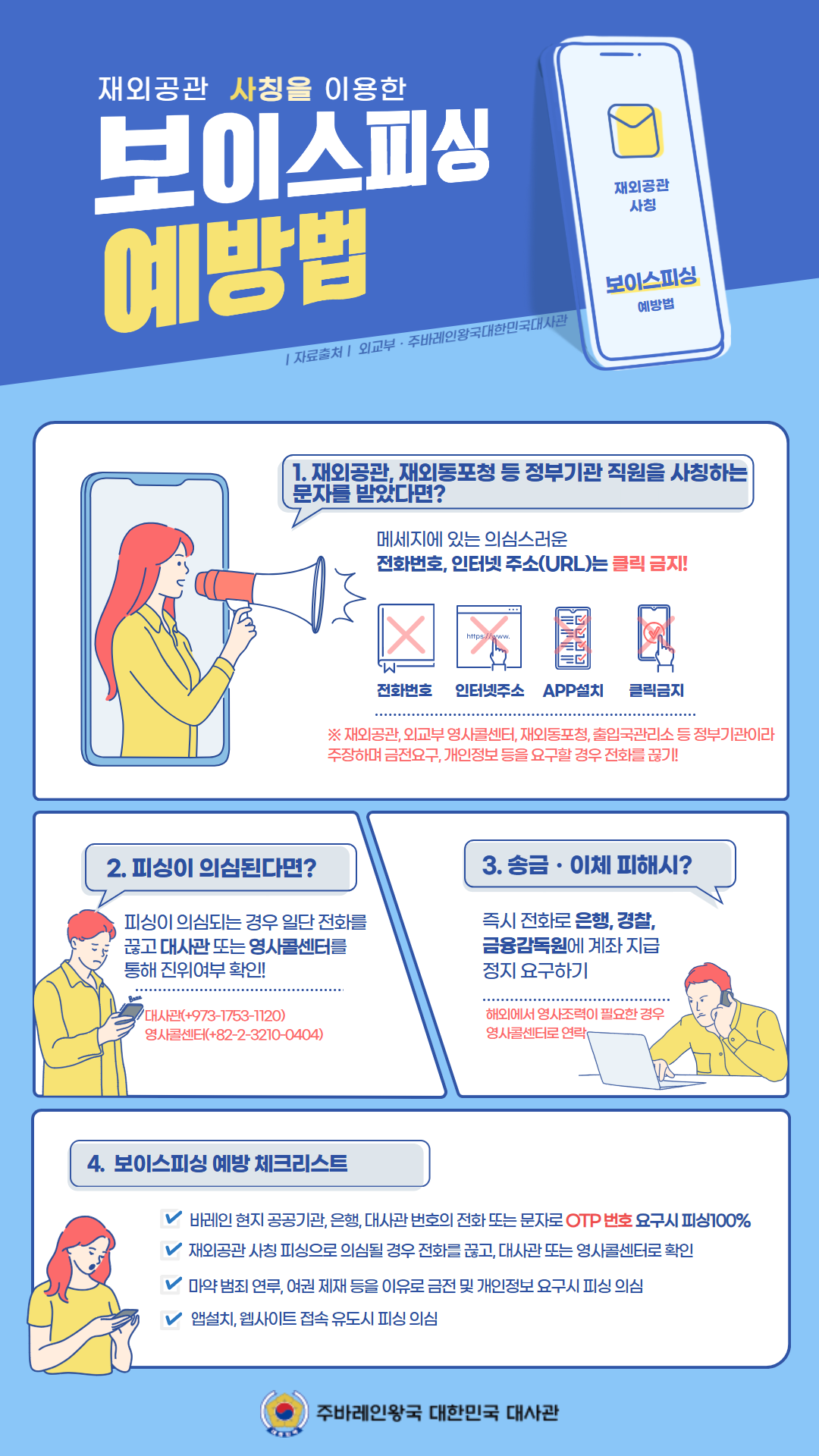 외교부 및 재외공관은 전화 메세지, 이메일 등으로 개인정보나 금전 송금 등을 요구하지 않습니다.