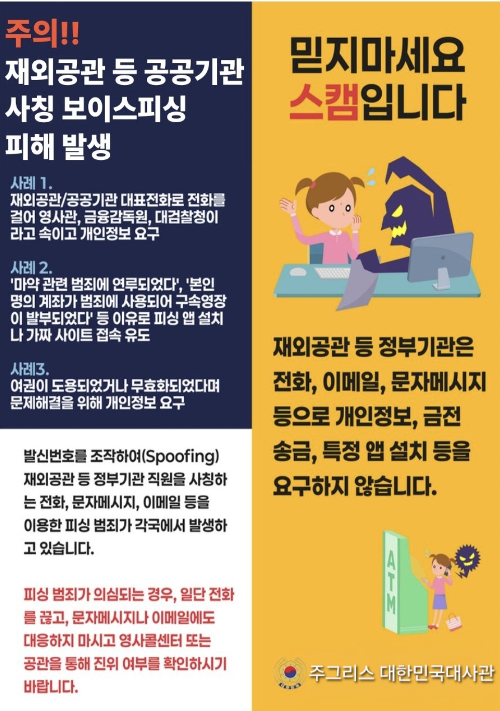 ㅇ 최근 유럽을 포함한 다수의 국가에서 재외동포를 상대로 정부기관을 사칭하며 개인정보나 금품을 요구하는 사기 피해 사례가 접수되고 있습니다.