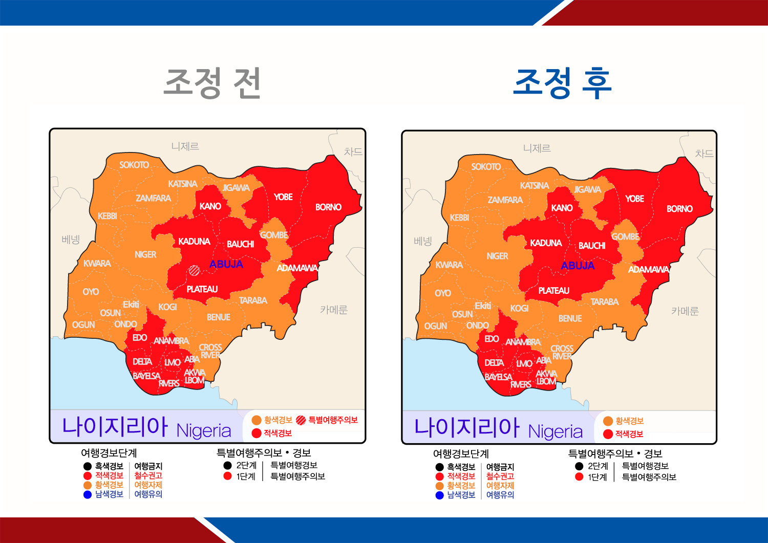 - 조정내역 : 수도 아부자에 발령된 특별여행주의보를 적색경보(철수권고)로 조정