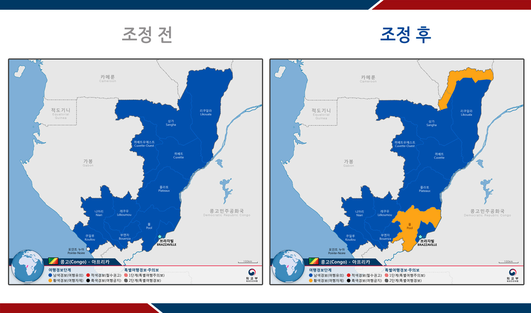 - 브라자빌(Brazzaville) 市, 포인트 누아(Pointe Noire) 市 : 미발령 → 1단계 남색경보(여행유의)